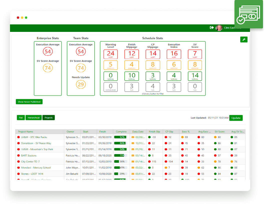 View all of your projects at a glance. Easily identify projects at risk and drill down to view details. See which projects have the best schedule quality and which project teams are executing schedules best.