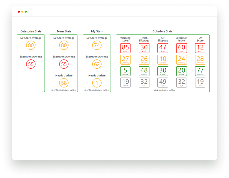Three dashboards allow users to quickly view and report on schedules. From a single schedule to all projects across the Enterprise.