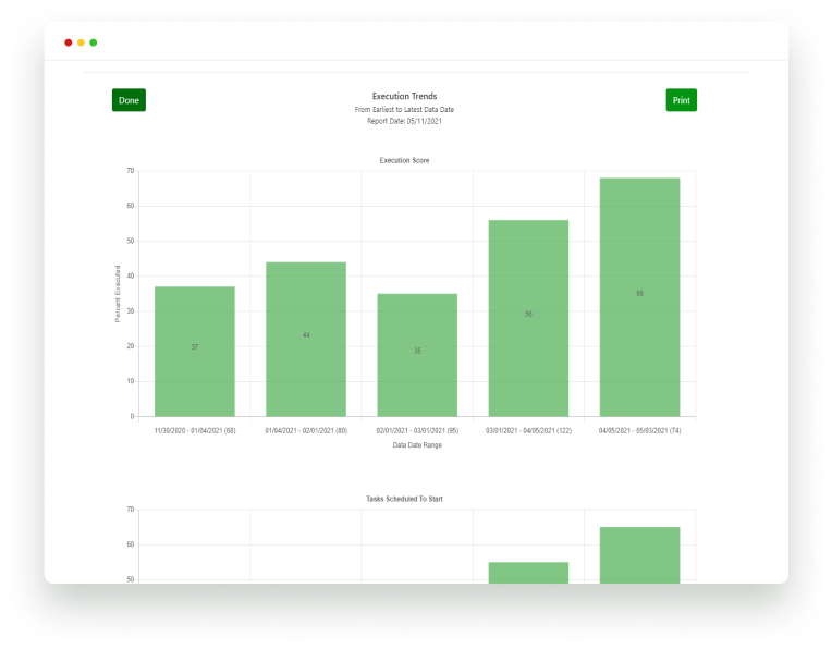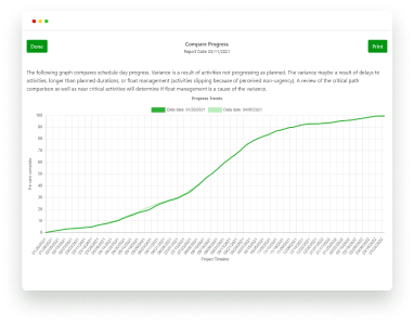Generate narratives and graphs detailing schedule performance. Performance reporting includes execution, planned vs. actual progress, and more.