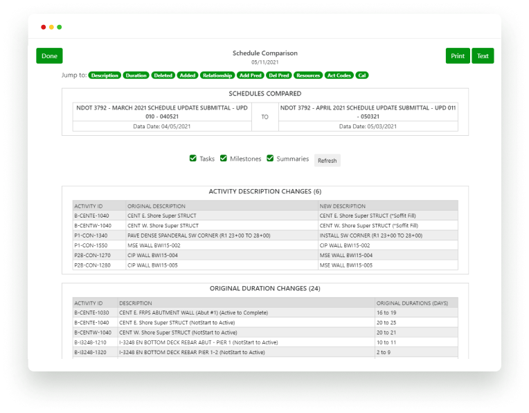 Generate easy-to-read comparative analyses with enhanced details that can be used directly in your own narrative reports. Easily compare schedule changes, milestone status, critical path analysis, and more.